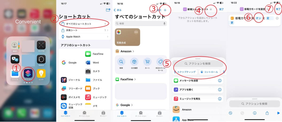 - アクション・・・・操作のこと。ショートカットはアクションを組み合わせて作ります