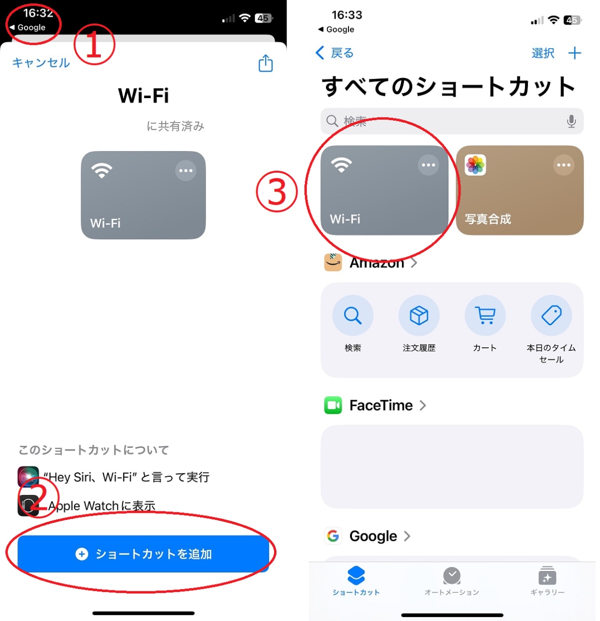 ①iPhoneのGoogleなどの検索サイトで「iphone ショートカット (追加したいショートカット名)」と検索しレシピの「ショートカットを入手」をタップ