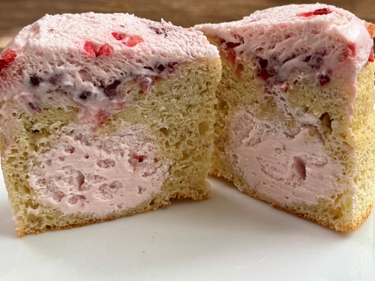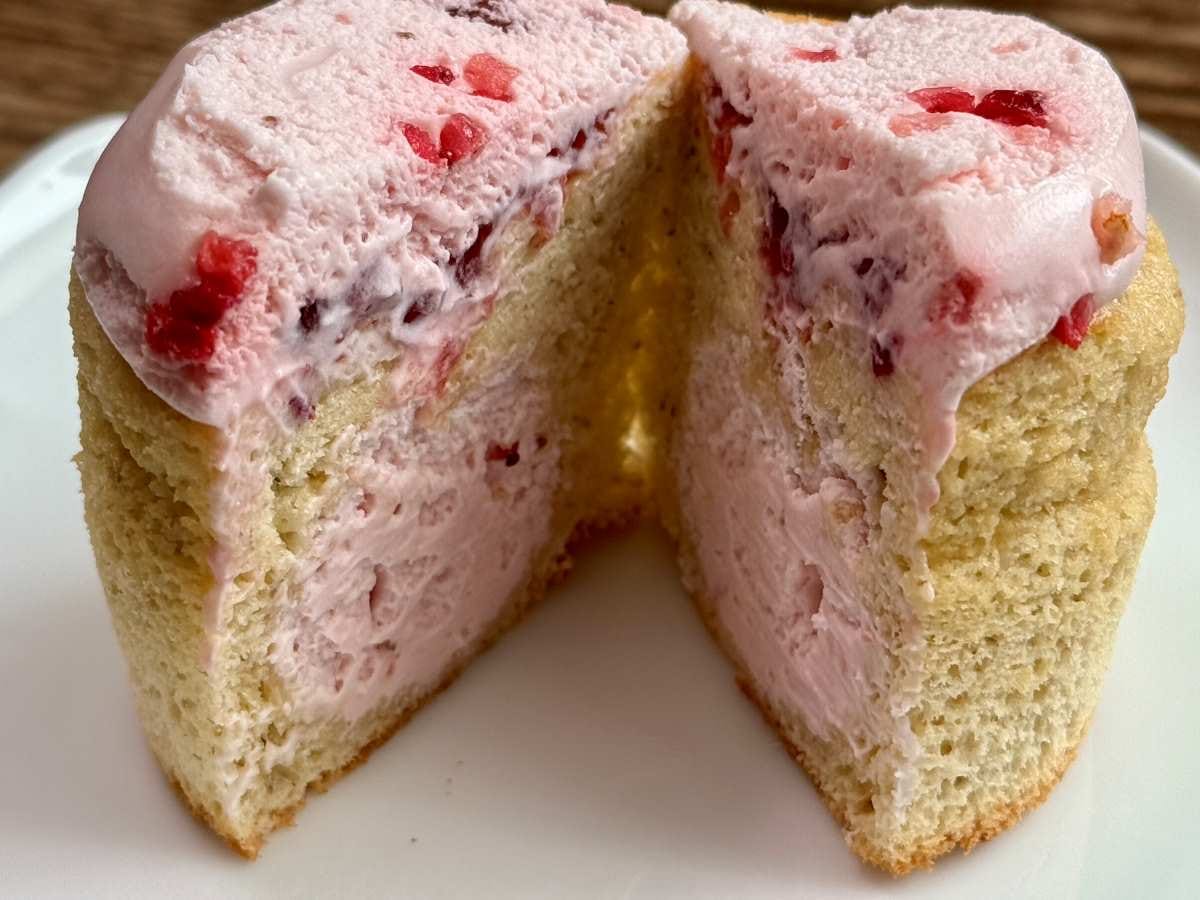 上にも中にもいちごの果肉がたっぷり入っている様子がわかります!では早速いただきます。