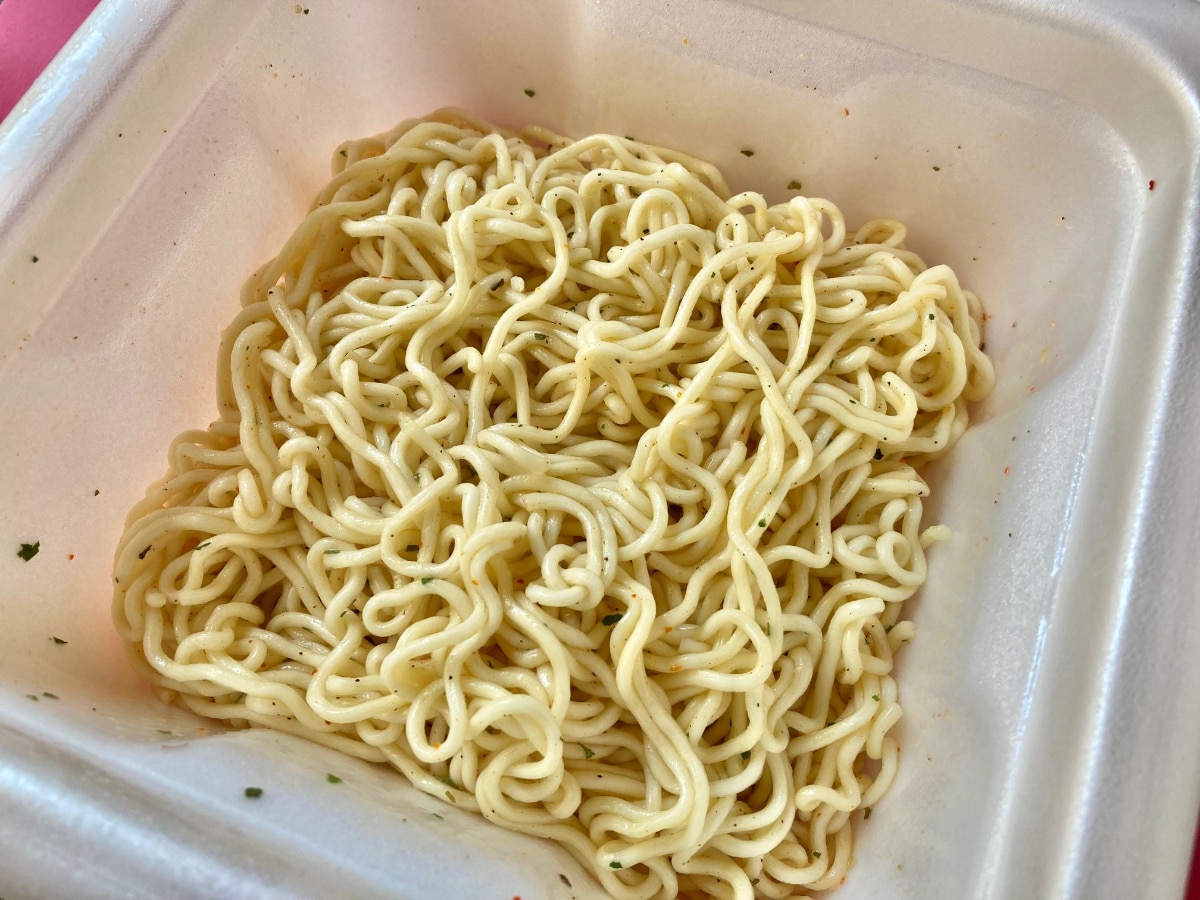 そのあとは、香味油を入れて麺をほぐしてから、シーズニングを入れてしっかりかき混ぜます。