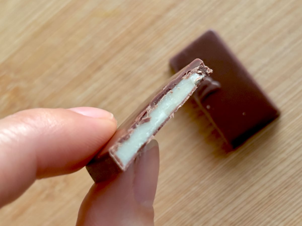 半分に切ってみると、中には白い層が。「アンフィニマン ヴァニーユ」と言えばというリッチなバニラをイメージした生チョコレートだそうで、本商品のキモとなる部分。