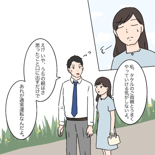 「私、タケルのご両親とうまくやっていける気がしないよ。」とハッキリ伝えました。すると焦ったようにタケルは「え!?いや、家の親はさ、思ったこと口に出すだけであれが通常運転なんだよ。」とフォローのつもりで言ったのかもしれませんが、それならなおさら無理だな、と思ってしまいました。
