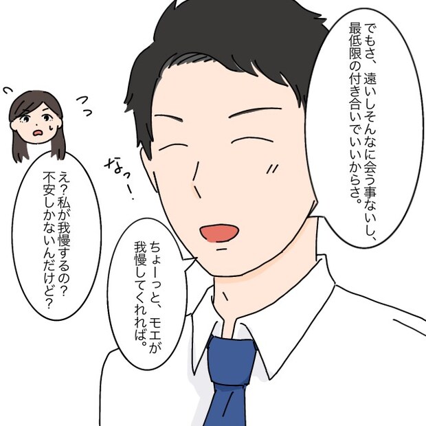 タケルはそれでも義両親の失礼な態度を悪く思う様子はなく、「でもさ、遠い市そんなに会うことないし、最低限の付き合いでいいからさ。」と適当なことを並べ「ちょーっと、モエが我慢してくれれば。」と言ったのです。思わず「え?私が我慢するの?不安しかないんだけど?」と口走った私です。