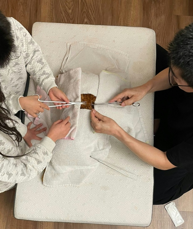 友達にもらった大切なぬいぐるみが破れて娘が泣いていたので一緒に手術で治しました。手術用ハサミを少しプロっぽく扱えるようになりました。