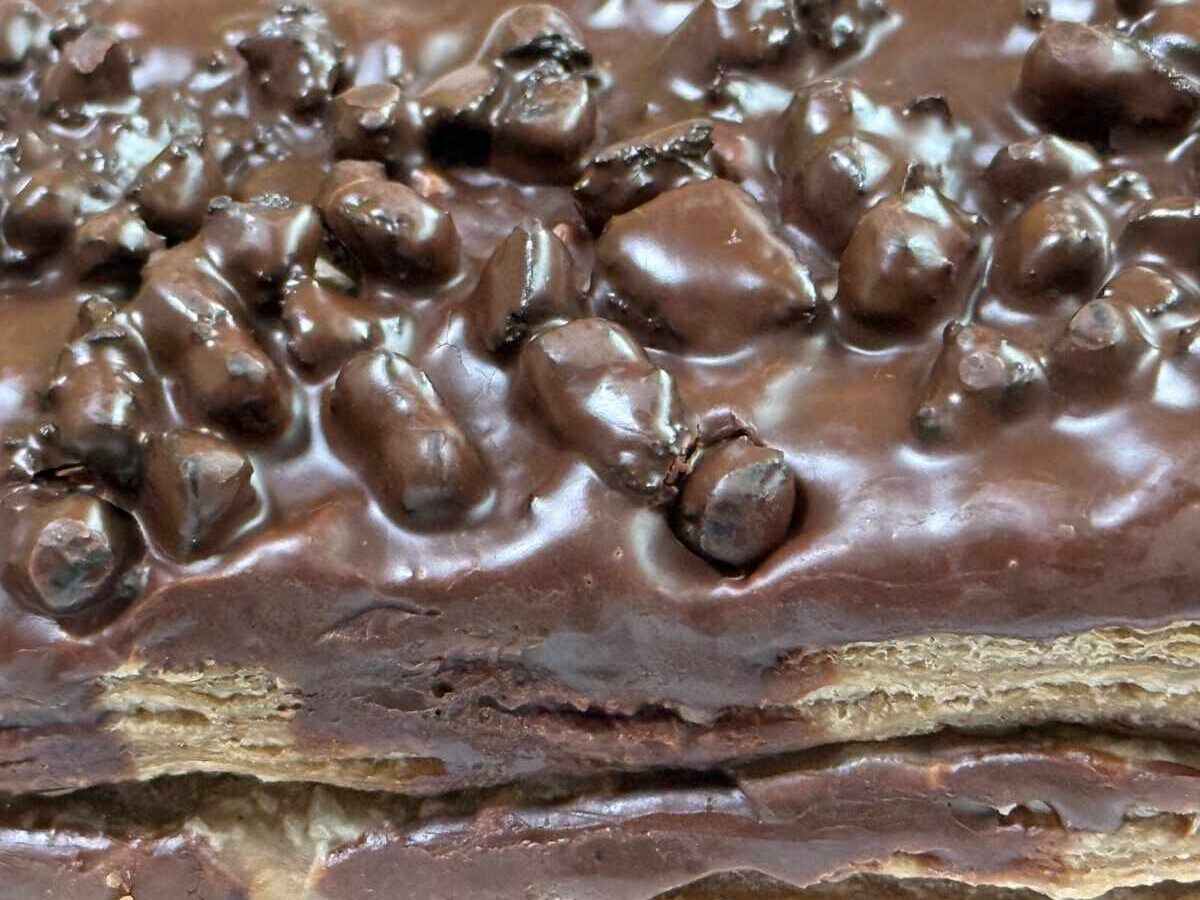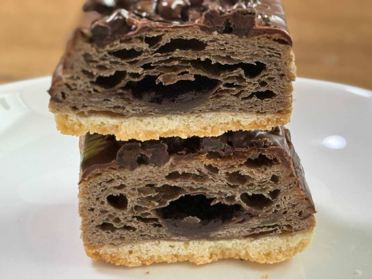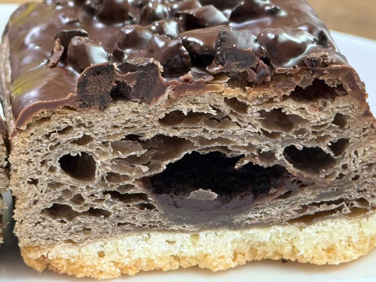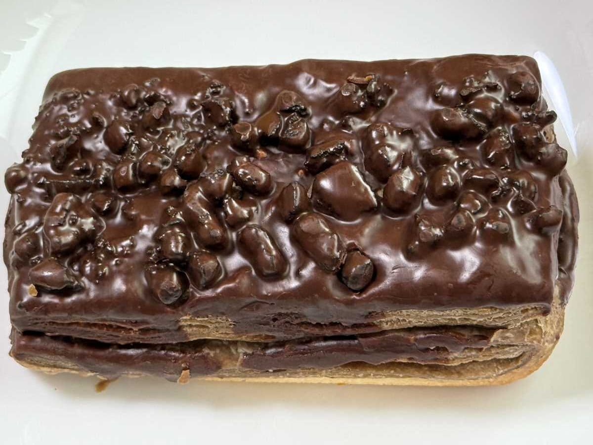 表面のチョコレート部分はドーナツと一緒でしょうか?ミルクチョコレートにほろにがいココアクッキーが乗っていて、ブラックサンダーそのものでした。パイ生地は少し塩味が効いていて、チョコレートの甘味をより引き出していました。底のタルト生地がよりザクザクした食感を生み出して、なくてはならない存在です。