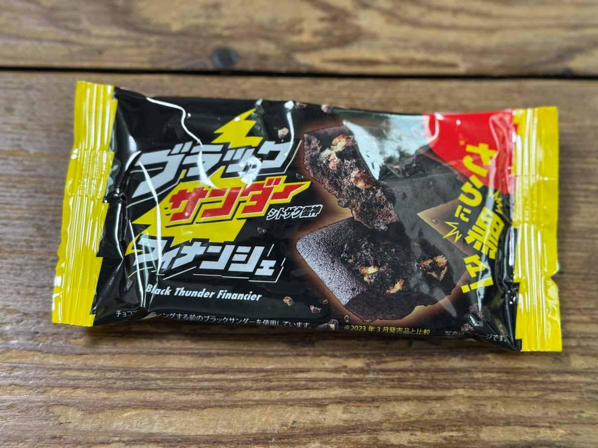 上に乗っているブラックサンダーもよく見かけるサイズ感。その一回り大きいサイズが今回紹介するフィナンシェになります。