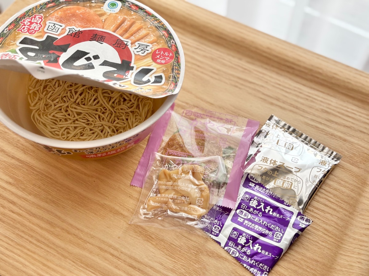 ファミリーマートのカップ麺コーナーで発見した今回のカップ麺。フタを開けるとカップの中には麺とかやくのほか、後入れのレトルトメンマ、液体スープ、粉末スープが入っていました。かやくを入れたら熱湯を注いで再度フタをします。