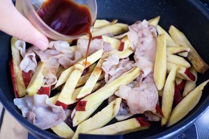 3. フライパンで豚肉を炒め、火が通ったらさつまいもを加えます。