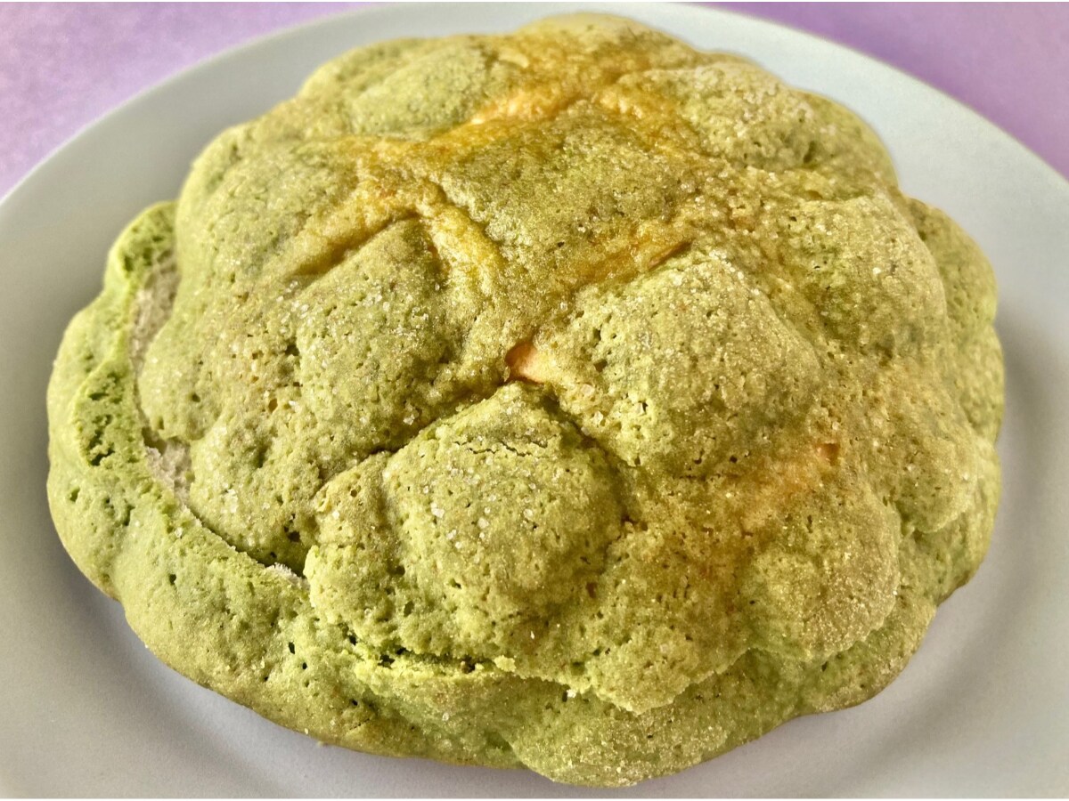外はサク、なかはふわっとしていて、メロンパンらしい食感。外側の生地はとっても甘く、抹茶の味わいもちゃんとありました。