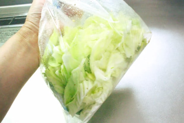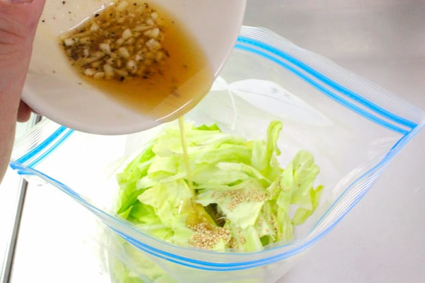 キャベツの量に対してたれが少なめなので、全体にたれが絡むように、袋を10回ほど振りました。