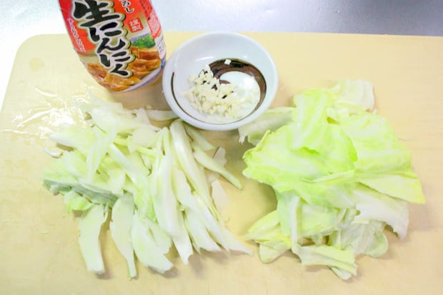 1. キャベツの葉の表面を、きれいに洗います。葉を手でちぎり、白い部分は薄切りにします。にんにく1かけはみじん切りに、もう1かけはすりおろします。