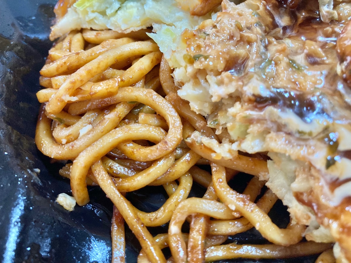 焼きそばは具材なしで麺のみ。鉄板で焼いたような硬い部分があり、食感が面白かったですね。