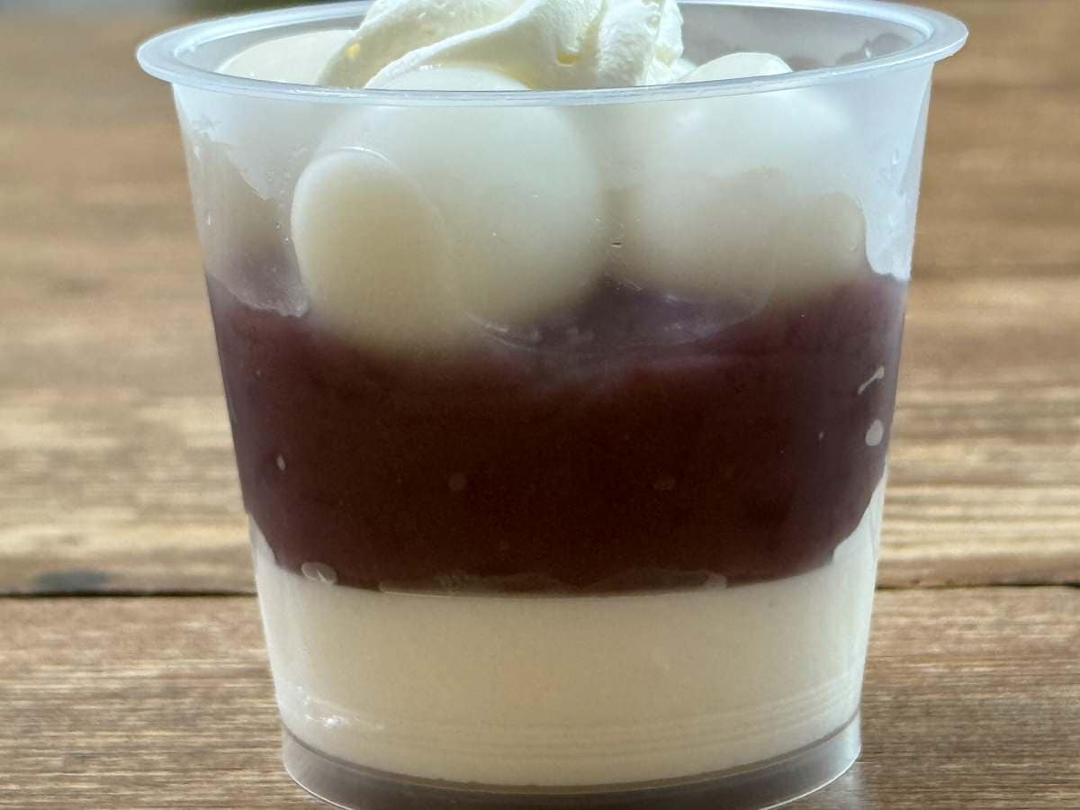 可愛らしいホイップクリームと程よい大きさの白玉4つ、ボリューム満点なつぶあんの下にはミルクムースが入っています。