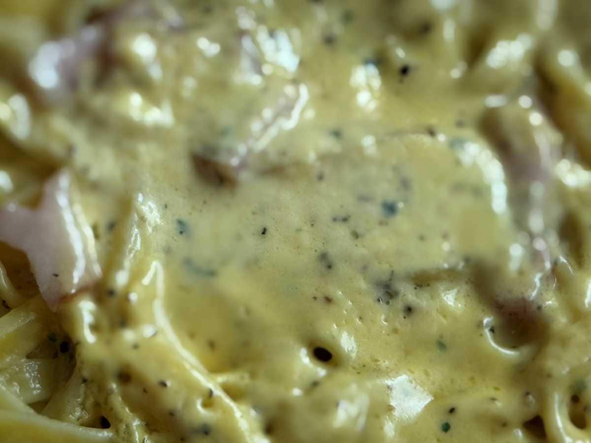 香りはチーズとクリームなどの乳製品の匂いと、ベーコンの香ばしい香りと黒コショウのピリッとした香りが相まって、もう匂いからして美味しそうな予感……!