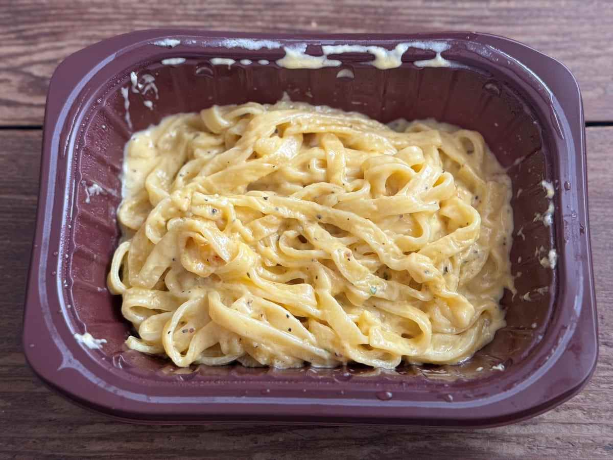 もちもちとした弾力のあるフィットチーネパスタの噛み心地がとても良いです。パスタはゆでたものを冷凍しているそうで、冷食とは思えないほど生パスタで、美味しいです。