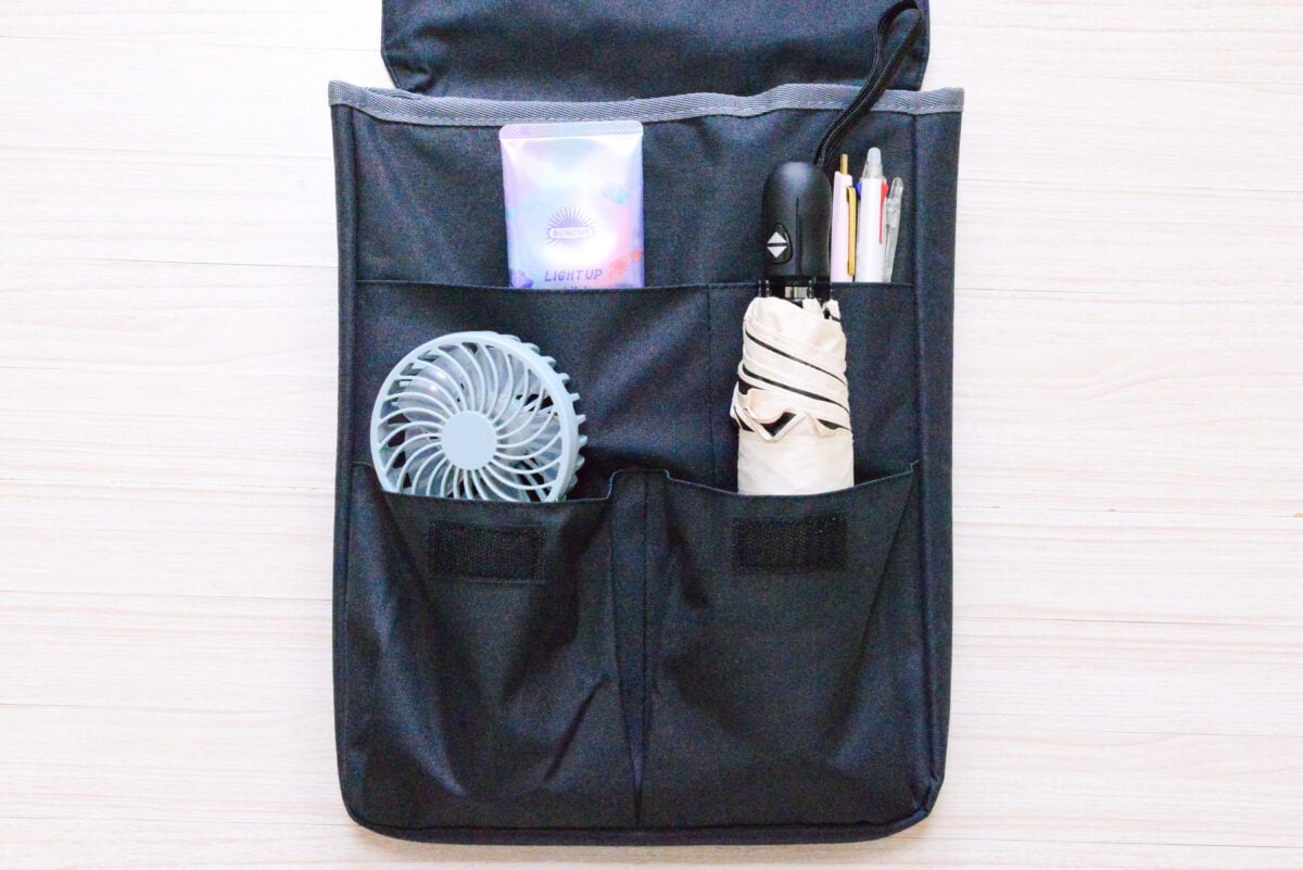 こちらには夏のお出かけを想定して荷物を入れてみました。ハンディファン、日焼け止め、日傘、ペン。