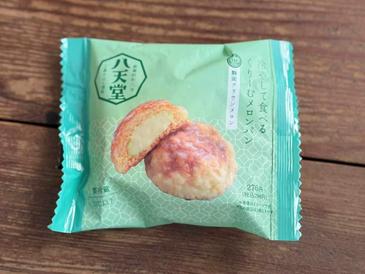 八天堂の冷やして食べるくりーむメロンパンです。「マスクメロンの王様」と呼ばれる静岡県産の「クラウンメロン」のピューレを使用したメロンクリーム入りメロンパン。ファミリーマート限定商品です。