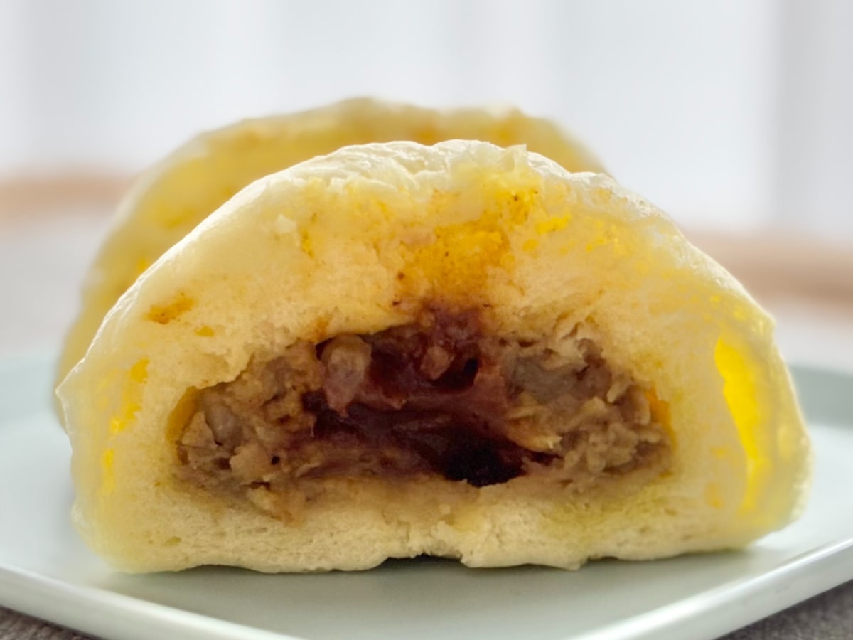 半分にカットしてみました。ふんわりとした生地の中にはたっぷりの黒豚。その中央にカレーソースが入っています。