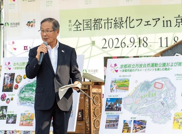 京丹波町の畠中源一町長による、5つのフェア拠点会場の見どころや整備状況などについての紹介も行われた。