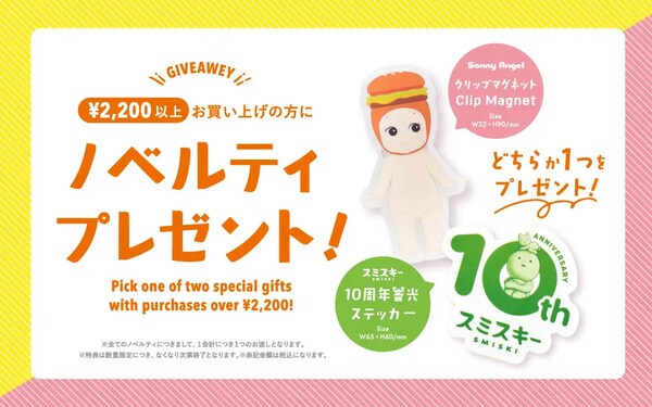 また、9月20日(土)より「SONIANDSMI」オープンを記念して、数量限定ノベルティプレゼントキャンペーンを実施。1会計あたりの合計金額2,200円(税込)以上を購入した人に、「Sonny Angel Snack Series クリップマグネット」または「SMISKI 10周年記念 蓄光ロゴステッカー」の2種のうち、いずれか1つがプレゼントされる。