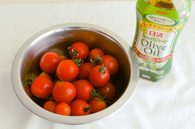 今回はオーブンで作るセミドライトマトに挑戦。天日干し不要なので、季節や天候を問わずに気軽に作れるのがうれしい♪材料はミニトマトとオリーブオイルの2つだけ。さっそく仕込んでみます。