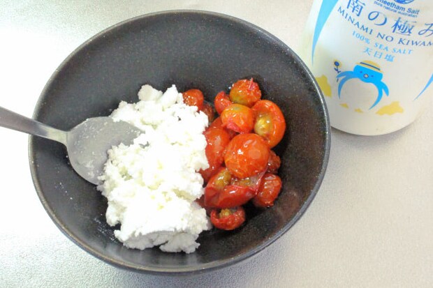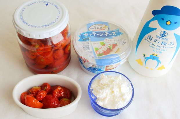 材料は2人分で「セミドライトマトのオイル漬け」50gとそのオイルを適量、カッテージチーズ50g、塩はお好みで。