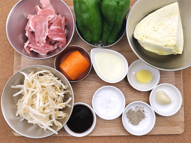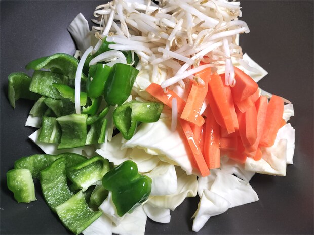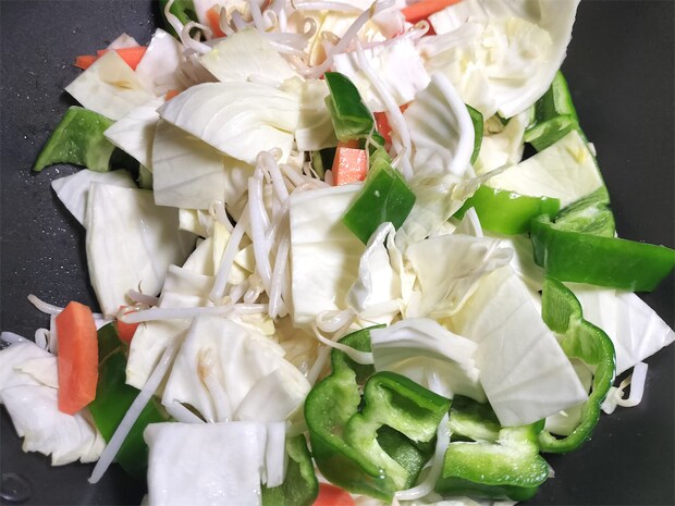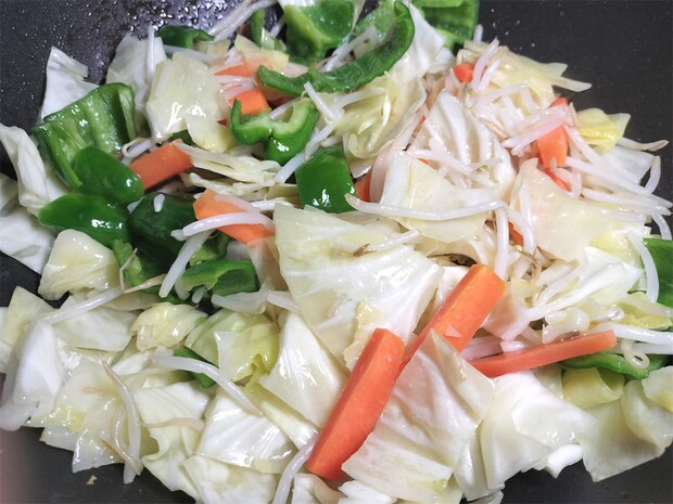 1. キャベツ、ピーマン、にんじんをフライパンに入れ、もやし、サラダ油大さじ1を加えて絡めます。