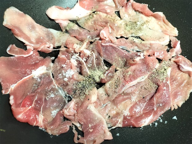 3. フライパンを軽く拭いてサラダ油大さじ1をひき、豚肉を広げて塩と黒こしょうを振ってから、両面を強めの中火で焼きます。