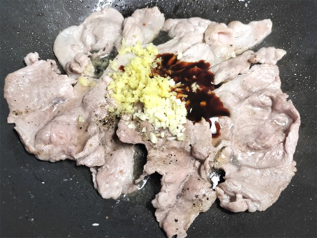 4. 豚肉の色が変わったらにんにく、しょうが、オイスターソースを加えて軽く炒めます。
