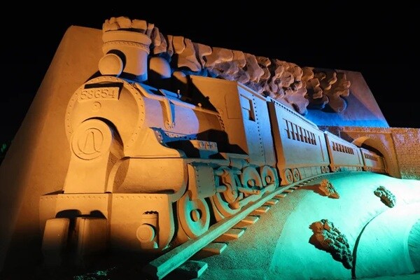 3つ目は、光と音が織りなす幻想のナイトミュージアム。日没後の会場は、昼間の姿から一変し、幻想的な劇場へと姿を変える。砂像は光と音によって新たな表情を見せ、幻想的な世界に誘う。光と音のショーは毎日開催され、平日は19時と20時の2回開催される。さらに土日祝日には、ショーのフィナーレに夜の砂像を彩る花火も打ち上げ予定。秋の心地よい海風を感じながら、砂と光が紡ぐ非日常的かつ美しい時間を過ごすことができる。
