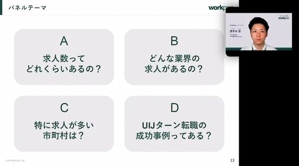 四国4県を対象にした今回のウェビナーは、「UIJターン転職とは?」「四国での仕事について(求人・転職の市場感、給与相場など)」「四国での暮らしについて(物価、交通、レジャーなど)」「ワークポートの紹介」の4つのコンテンツで構成される。