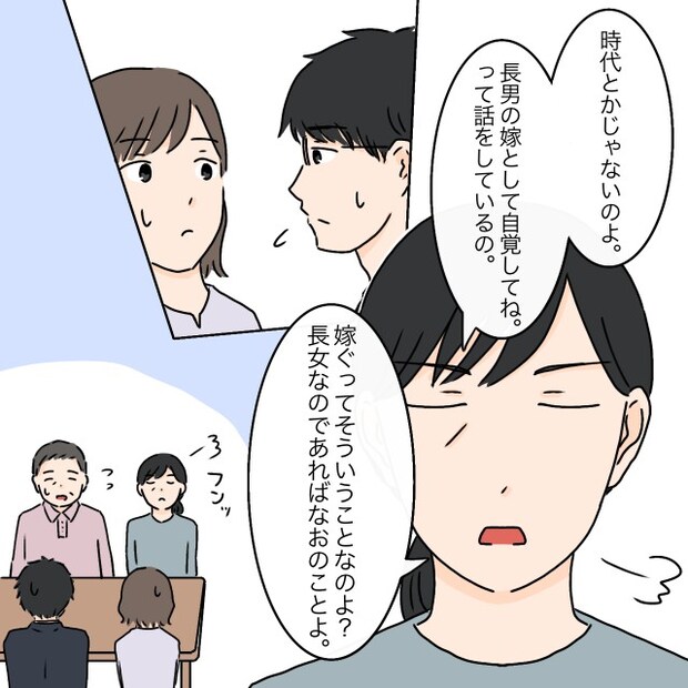 「時代とかじゃないのよ。長男の嫁として自覚してね。って話をしているの。嫁ぐってそういうことなのよ?長女なのであればなおのことよ」鼻息荒く語り出す義母に義父も動揺していました。