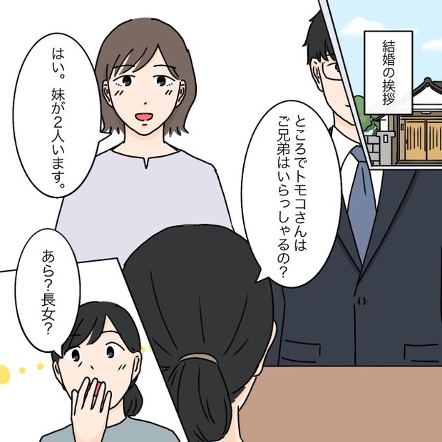 「ところでトモコさんはご兄弟はいらっしゃるの?」義母にそう聞かれ、「はい。妹が2人います」と答えると、「あら?長女?」と間髪入れず義母が質問。