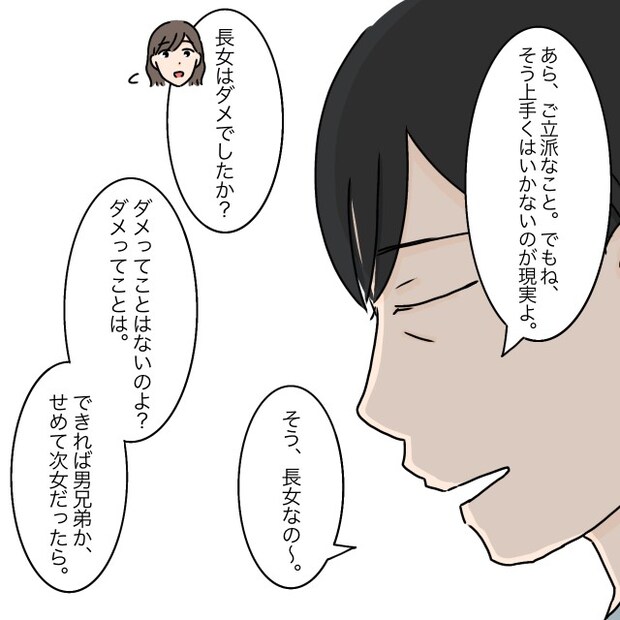「あら、ご立派なこと。でもね、そう上手くはいかないのが現実よ」と言った後、「そう、長女なの~」と一言。それを聞いて、「長女はダメでしたか?」と聞くと、「ダメってことはないのよ?ダメってことは。できれば男兄弟か、せめて次女だったら」と勝手なことを言い出す義母に、
