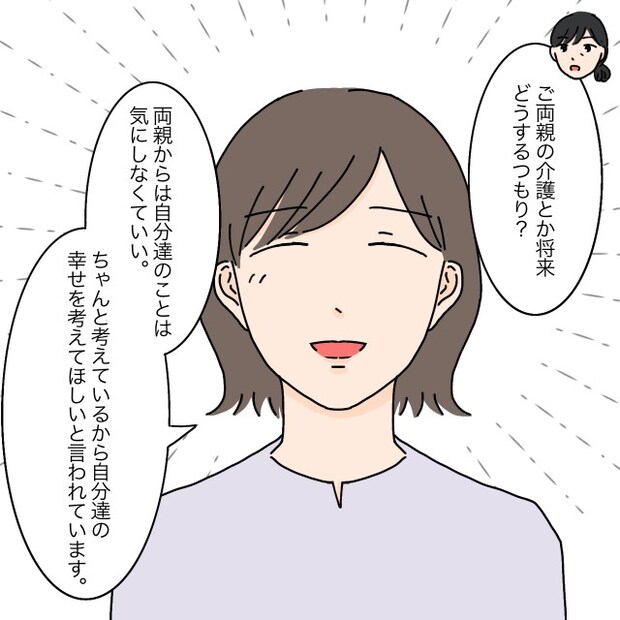さらに、「ご両親の介護とか将来どうするつもり?」と未来の話をする義母に、「両親からは、自分達のことは気にしなくていい。ちゃんと考えているから、自分たちの幸せを考えて欲しいと言われています」と笑顔で答えると、
