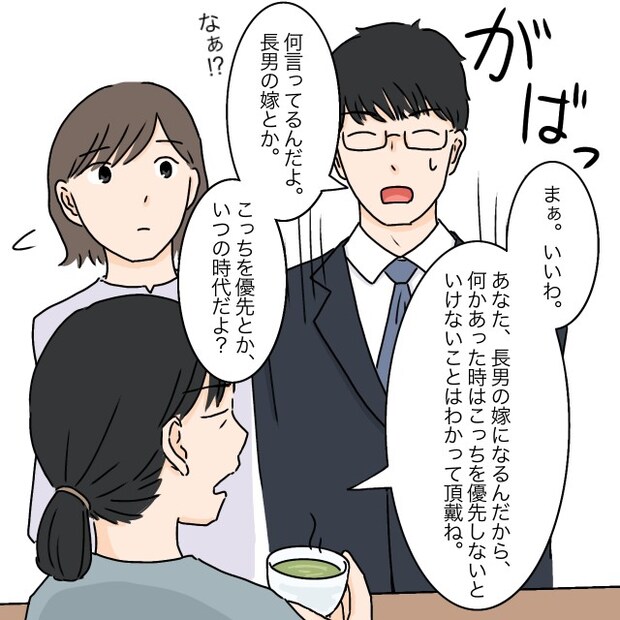 「まぁいいわ。あなた、長男の嫁になるんだから、何かあった時はこっちを優先しないといけないことはわかって頂戴ね」義母がシレっと言うと、「何言ってるんだよ。長男の嫁とか。こっちを優先とか、いつの時代だよ?」と夫が立ち上がって反論すると、