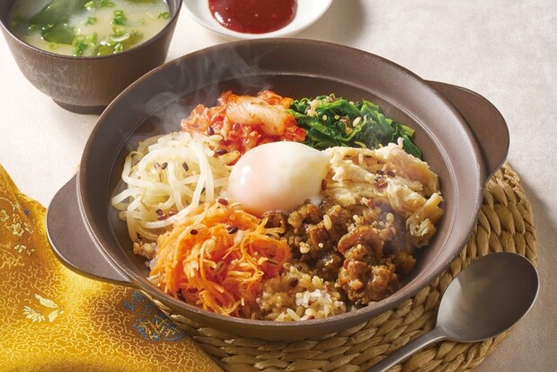 炭火焼肉の香ばしさが食欲をそそる、ボリューム満点のビビンバ。人参やほうれん草などの緑黄色野菜に、良質なたんぱく質である蒸し鶏と温泉卵を組み合わせた。コチュジャンで味変も楽しめる。