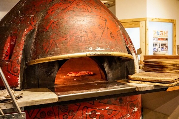この店のシンボルとも言える、真っ赤に燃える薪窯。ナポリから船便で運ばれてきた特注の一基。500度を超える高温の中で、ピザはほんの数分で焼き上がる。その火の音すら、どこかこの町の鼓動のようにも聞こえてくる。