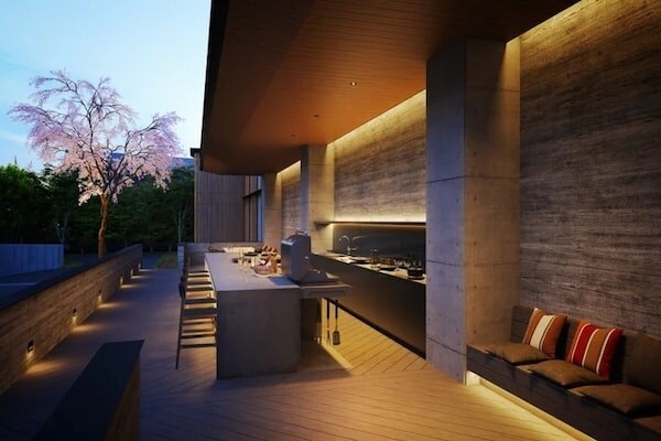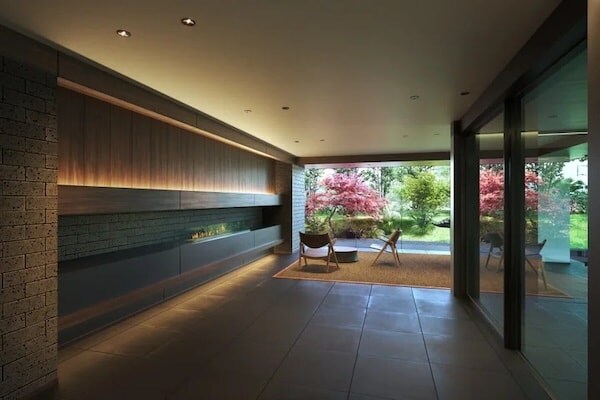 共用部のエントランスホールは、インテリアデザインや内装、壁面の素材にこだわった。窓から望む美しい植栽とともに、上質で豊かな空間を演出している。また、軽井沢の自然に満たされながら、家族や友人とにぎやかで親しみにあふれた時間を過ごせる「ØST(オスト)ガーデンテラス」を設置した。