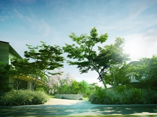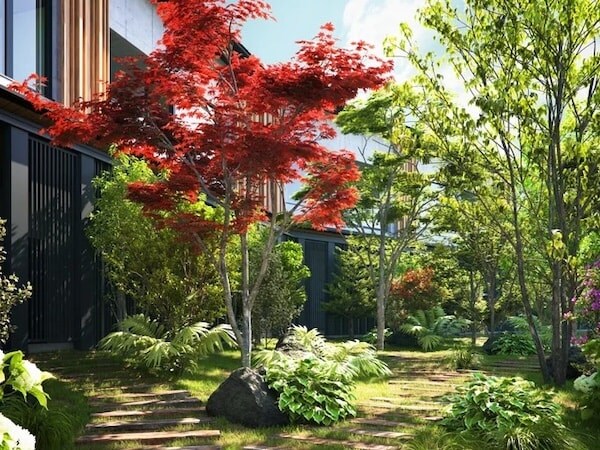 オストガーデン軽井沢の敷地には幻想的なカツラ並木があり、「EAST棟」と「WEST棟」の2棟がたたずむ。利便性の高い街の中にありながら、コンセプトである“美しい自然との融合”を目指し、アプローチには浅間山の火山岩を用いた景石や軽井沢由来の樹木をあしらっている。2棟の間には、四季折々の美しい植栽とカラーリーフで彩る「センターガーデン」を設置し、軽井沢の森を表現した。