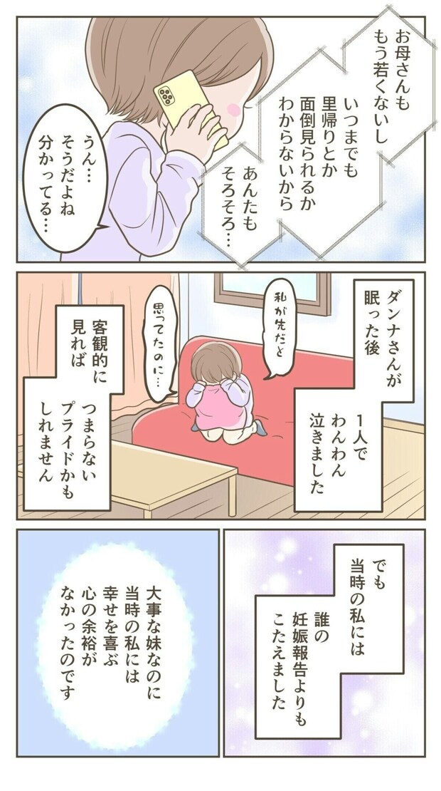 大事な妹のことなのに、素直に祝福する心の余裕がなかった妻。どんなに相手を大切に思っていても、自分のことで大きな悩みがあるときには、おおらかに受け止めることが難しいことがありますよね。特に妊娠は、誰しも思い通りとはいかないこと。妻の思いを想像すると、胸が締め付けられます。