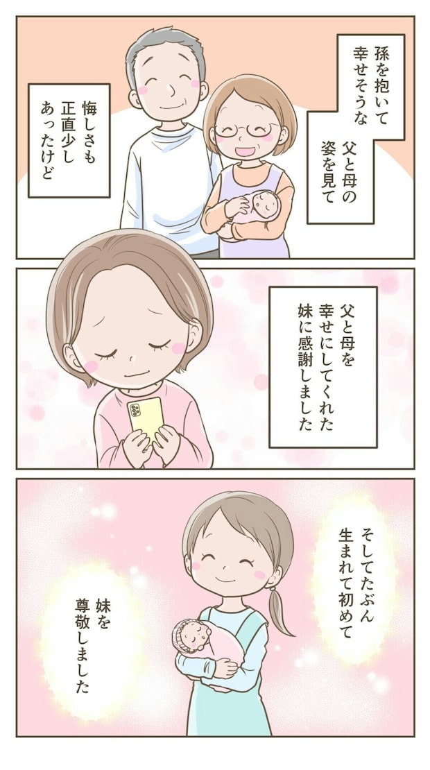 妹の妊娠報告を心から喜べなかった妻ですが、半年後、無事に生まれた赤ちゃんを見て素直に愛おしいと思えるように。孫を抱くうれしそうな両親の姿を見て、悔しい気持ちはありつつも、孫を授けてくれたことに感謝し、そして生まれて初めて妹を尊敬したそうです。