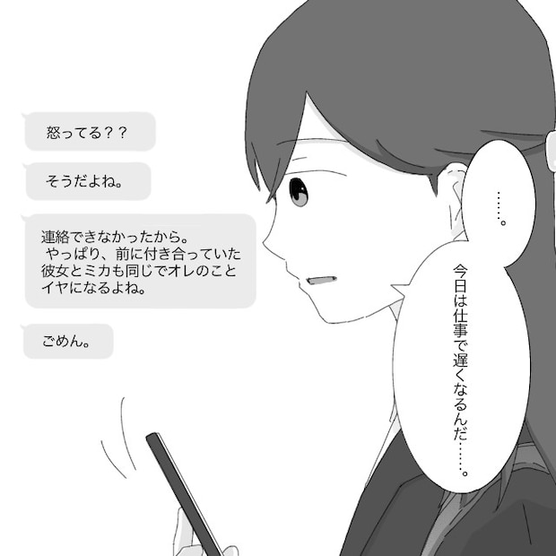 「今日は仕事で遅くなるんだ・・」と返信すると、「怒ってる??」「そうだよね」「連絡できなかったから。やっぱり、前に付き合っていた彼女と同じでミカもオレのことイヤになるよね」「ごめん」と落ち込んだ様子のメッセージ。
