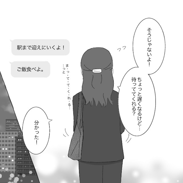 慌てて「そうじゃないよ!ちょっと遅くなるけど・・待っててくれる?」と送ると、レンから「駅まで迎えに行くよ!ご飯食べよ」と返信が来たのですぐに「分かった!」と返しました。久しぶりにレンに会えるんだ!