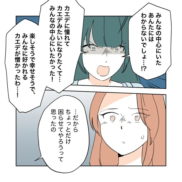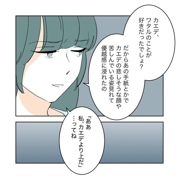 「カエデ、ワタルのことが好きだったでしょ?だからあの手紙とかでカエデの悲しそうな顔や苦しんでいる姿見れて優越感に浸れたの、私カエデより上だってね・・・」シズクは表情を醜く歪ませたまま、嫌がらせをした理由を淡々と話し続けます。