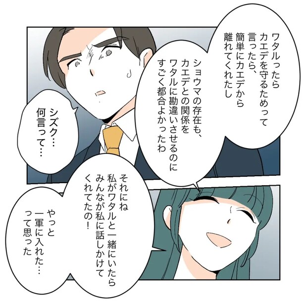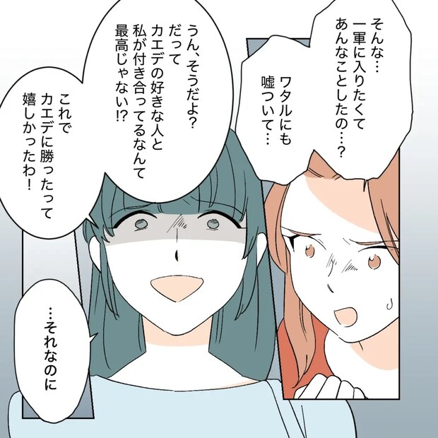 シズクはせきをきったように、自分が裏で糸を引いてワタルとカエデを引き離したこと、ショウマの存在をうまく使いワタルに勘違いをさせて自分と付き合うように仕向けたことを話し始めました。「それにね、私がワタルと一緒にいたら、みんなが私に話しかけてくれてたの!やっと一軍に入れた・・・って思った」と嬉しそうに言います。