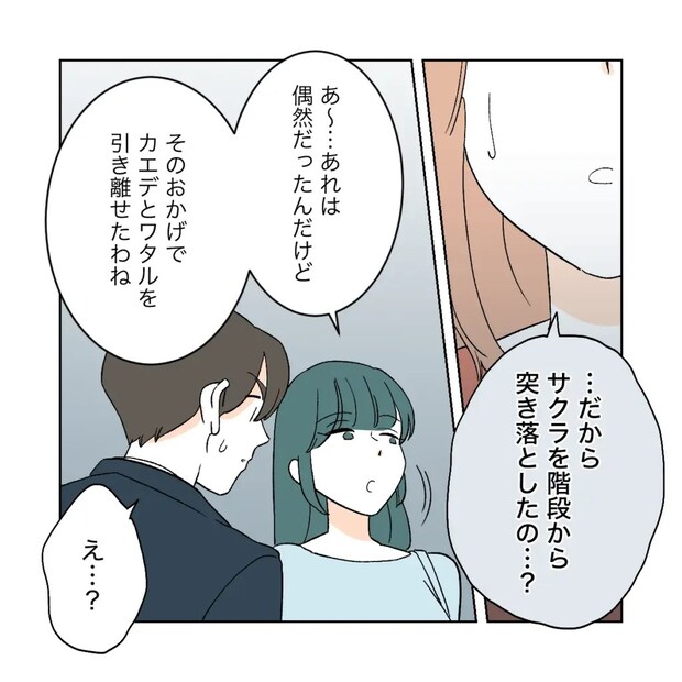 人気者の自分が疎ましくて嫌がらせをしていたと聞き、ショックをうけるカエデ。動揺しながら「・・・だからサクラを階段から突き落としたの?」と尋ねます。すると、シズクは「あ~・・・あれは偶然だったんだけど、そのおかげでカエデとワタルを引き離せたわね」と悪びれる様子もなく言いました。