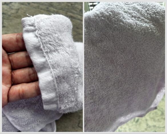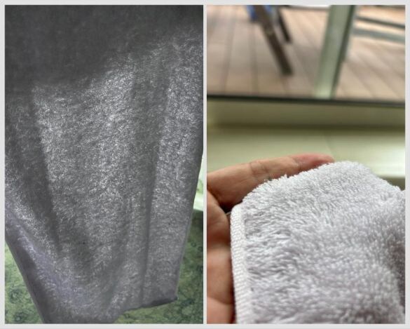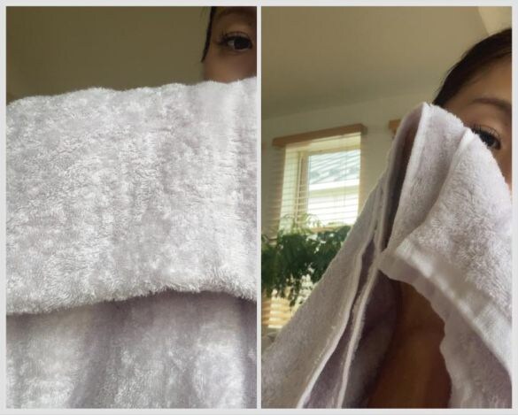 軽いということは、薄さもあります。タオルを光に透かすと、タオル全体から光がうっすらと差し込み、全体的に薄くその分、速乾性も期待できるのではと感じました。洗濯機で洗って脱水してみた結果