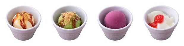 (左から)やわらかきな粉わらび餅、大人の珈琲ゼリー、炙って!ドーナツアイス、スイートポテトケーキ