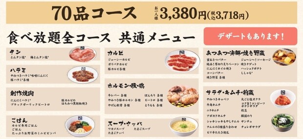 「デザート食べ放題」が対象となる「食べ放題コース」は、70品コース、牛角コース、牛タン・上焼肉コース、黒毛和牛コースの4つ。牛角アイス バニラ、牛角アイス 抹茶、季節のシャーベット、なめらか杏仁豆富、バニラアイス、抹茶アイスの6品は全コース共通。牛角コース、牛タン・上焼肉コース、黒毛和牛コースを注文の方のみ、やわらかきな粉わらび餅、大人の珈琲ゼリー、炙って!ドーナツアイス、スイートポテトケーキの4品も追加で食べ放題となる。